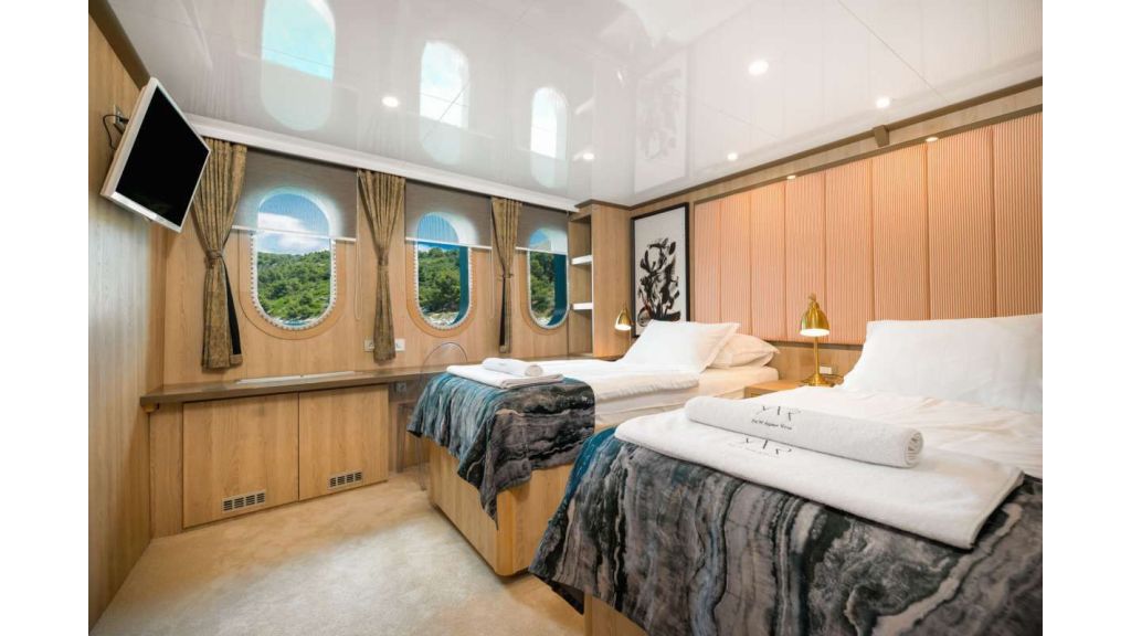Agape Rose is notable for her eleven cabin layout, offering great flexibility for a charter yacht of this size. Built in 2017, She offers guest accommodation for up to 22 guests with a layout comprising a master suite, two double cabins and seven cabins that can operate as twins or doubles. There are 19 beds in total, including 1 king, 4 queen and 14 singles. She is also capable of carrying up to 13 crew onboard to ensure a relaxed luxury yacht charter experience.