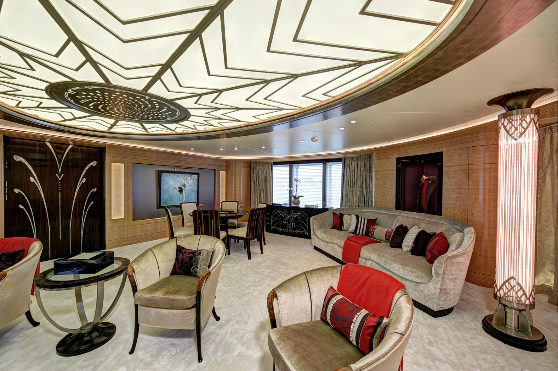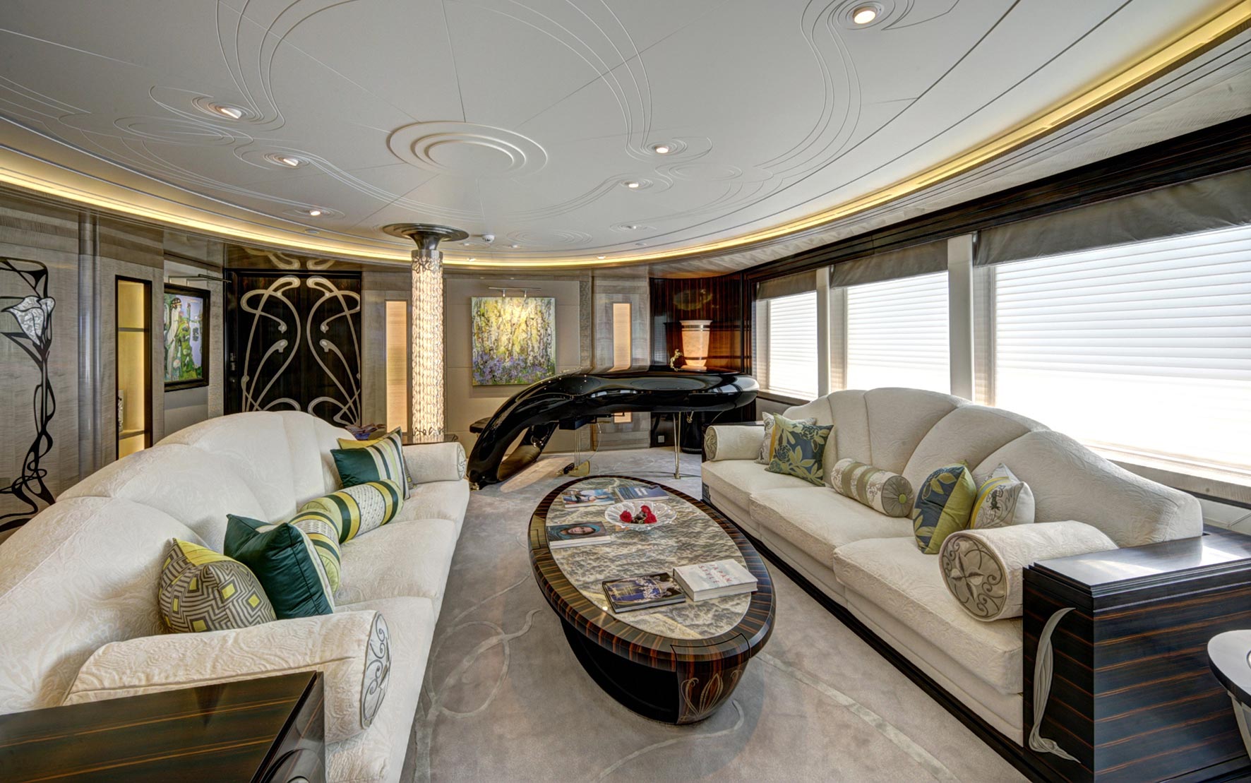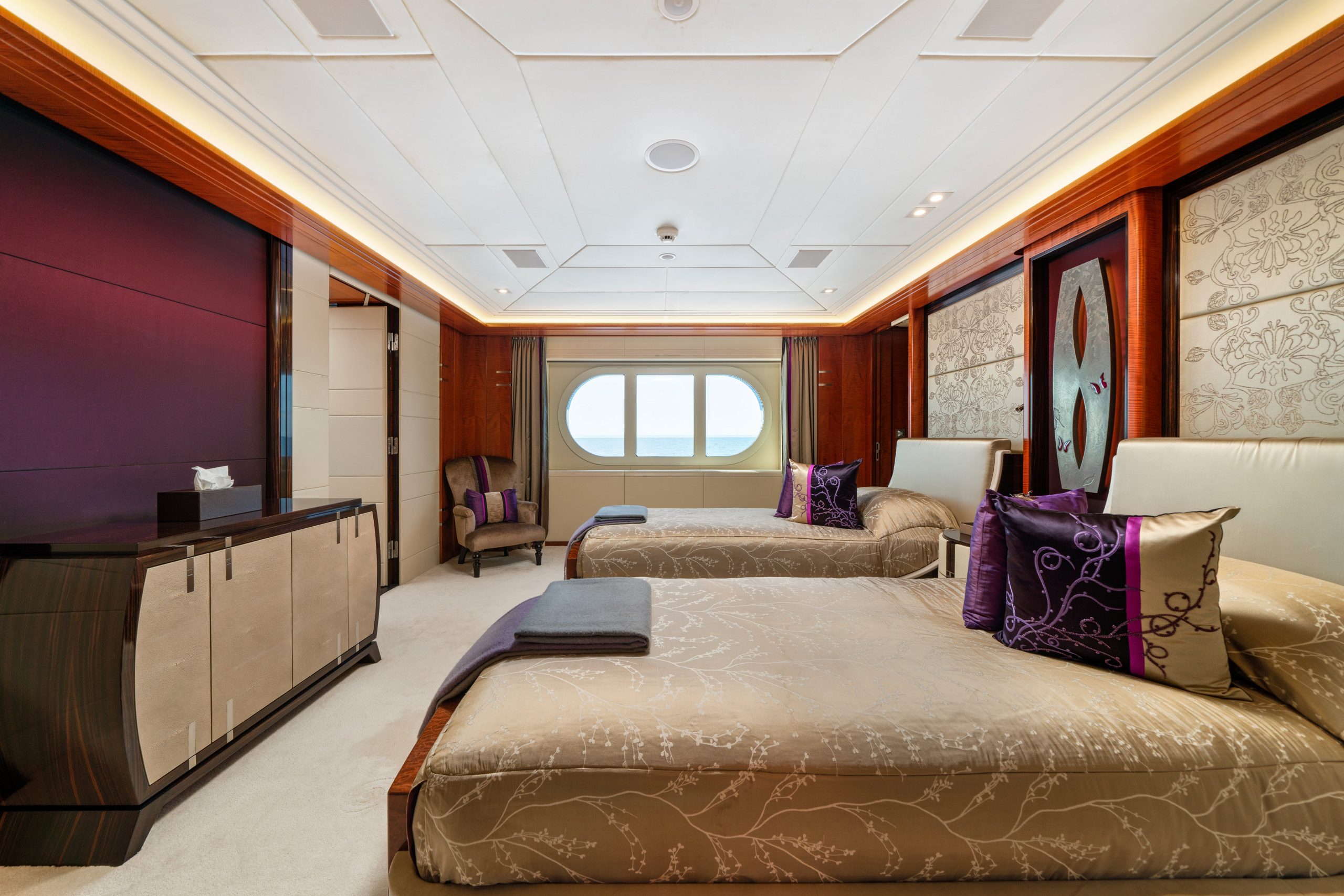 Comprised of 6 staterooms AMARYLLIS is capable of sleeping up to 12 guests with additional space for a discreetly accommodated crew of 23. Consistent with the Art Nouveau and Art Deco influences found in the social spaces, each of the suites are complete with soft taupe shades and warm tones. The VIP suite includes an automatic shoji screen to provide access to large panoramic views whilst the master suite, accessed through a dramatic curved lobby, comes with a full-beam study and desk carved from two extremely rare English woods – a perfect spot for attending to business whilst out on the water.