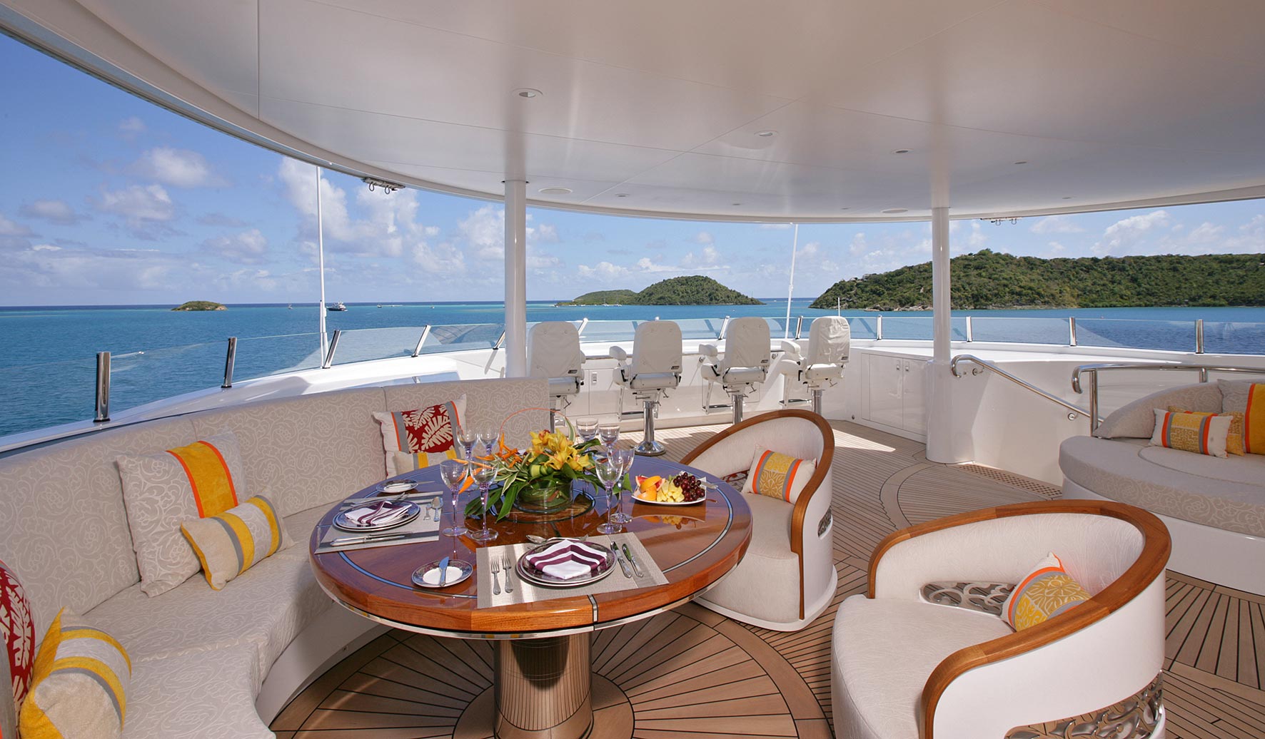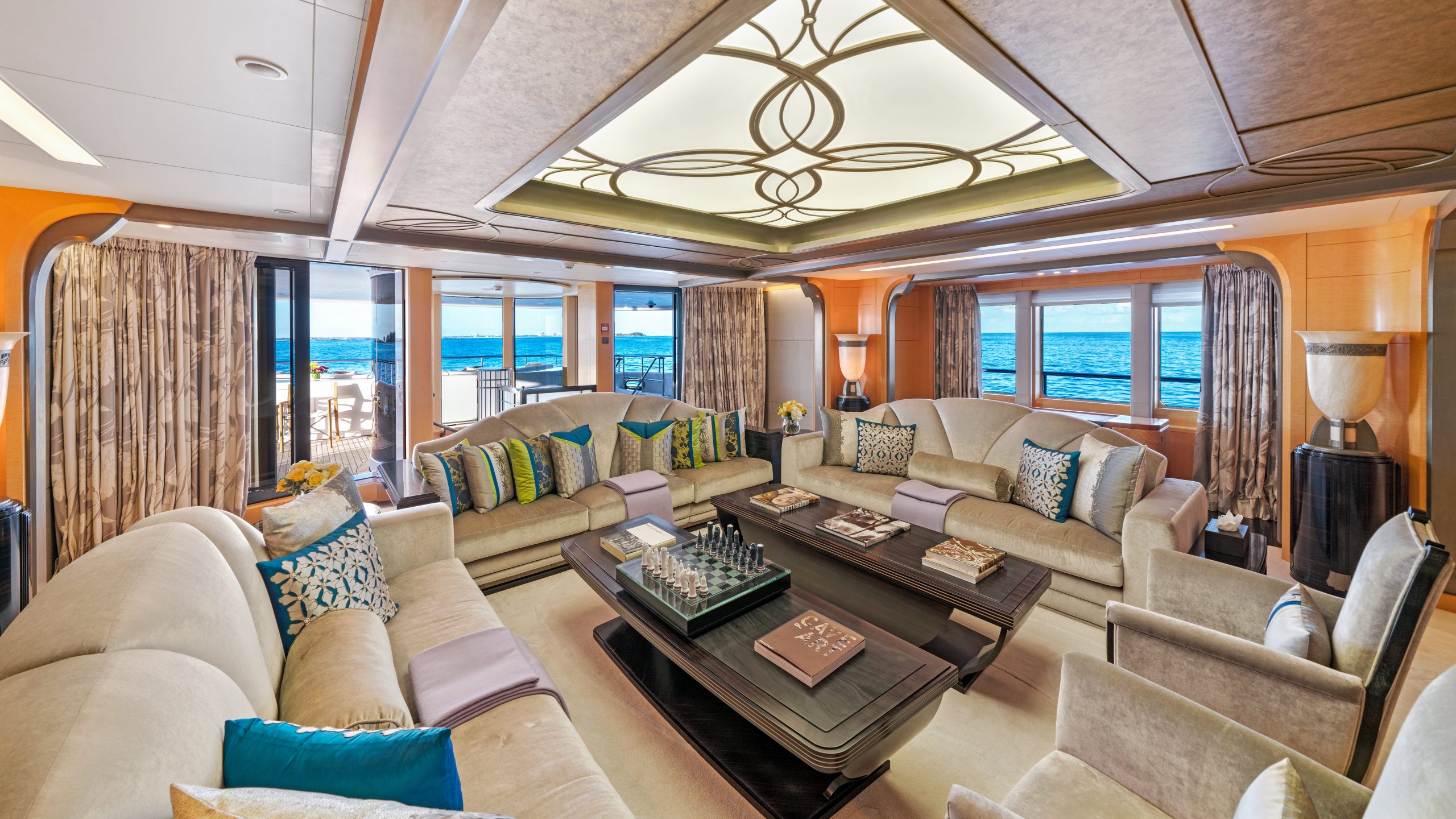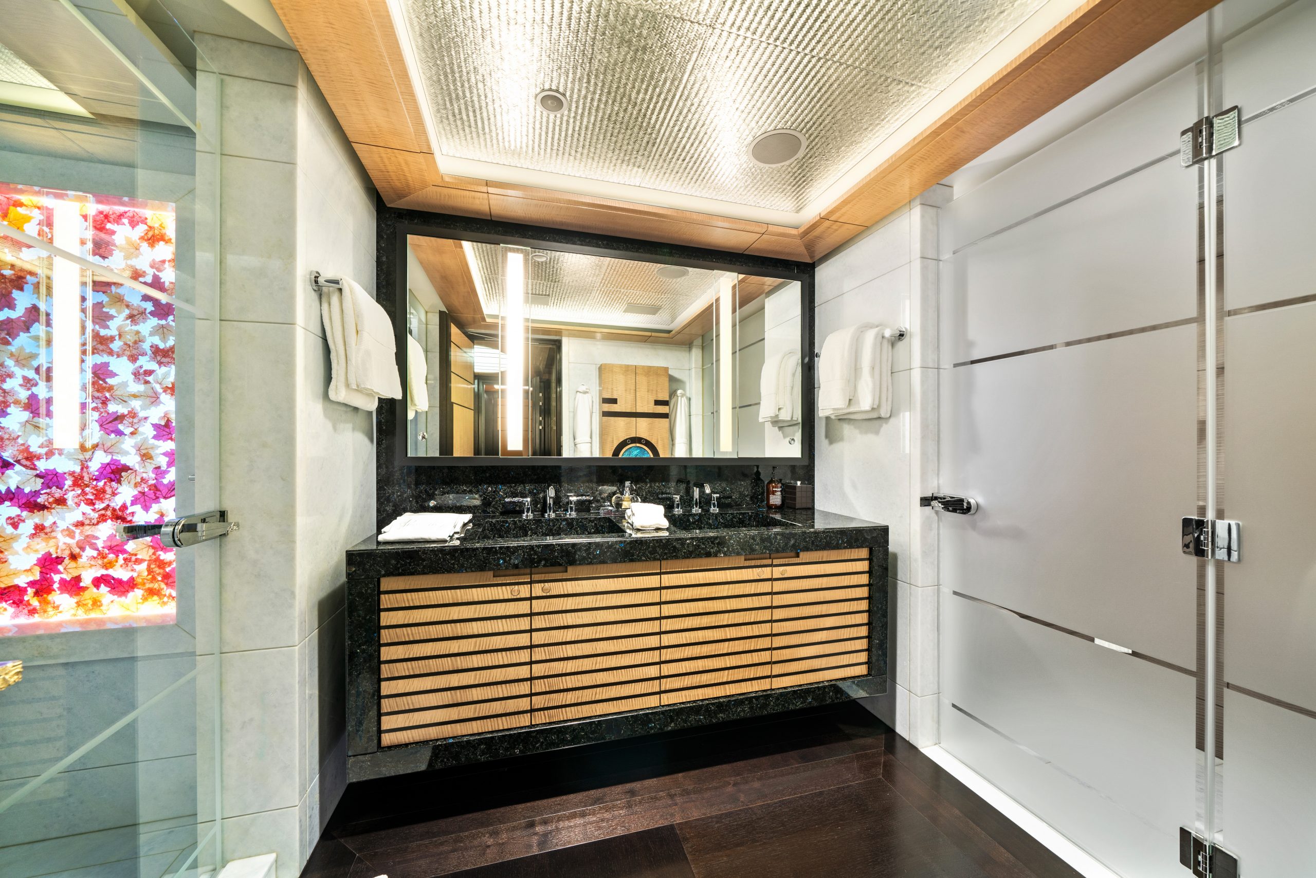 Comprised of 6 staterooms AMARYLLIS is capable of sleeping up to 12 guests with additional space for a discreetly accommodated crew of 23. Consistent with the Art Nouveau and Art Deco influences found in the social spaces, each of the suites are complete with soft taupe shades and warm tones. The VIP suite includes an automatic shoji screen to provide access to large panoramic views whilst the master suite, accessed through a dramatic curved lobby, comes with a full-beam study and desk carved from two extremely rare English woods – a perfect spot for attending to business whilst out on the water.