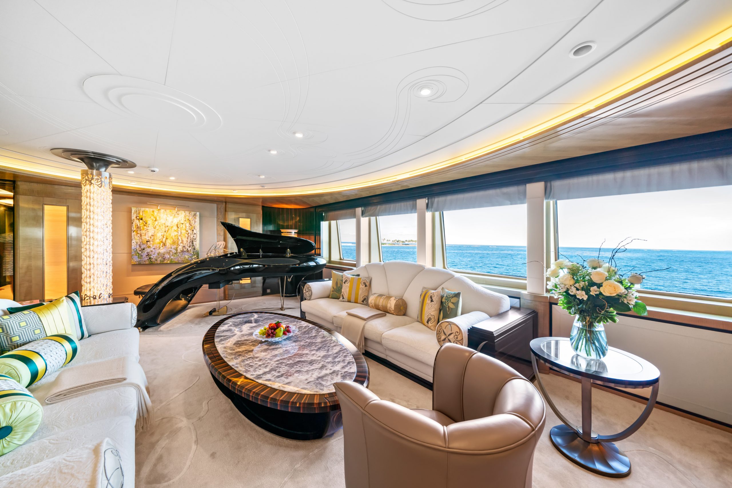 Boasting an elegant Schimmel Pegasus piano, the aptly named ‘piano lounge’ offers guests the chance to enjoy some after-hours cocktails in an appropriately glamorous setting. Entirely self-playing, guests are able to enjoy hours of beautiful music without having a virtuoso of their own. Another standout feature is the handcrafted limousine tender, which chaperones guests to AMARYLLIS ahead of their luxury charter vacation.