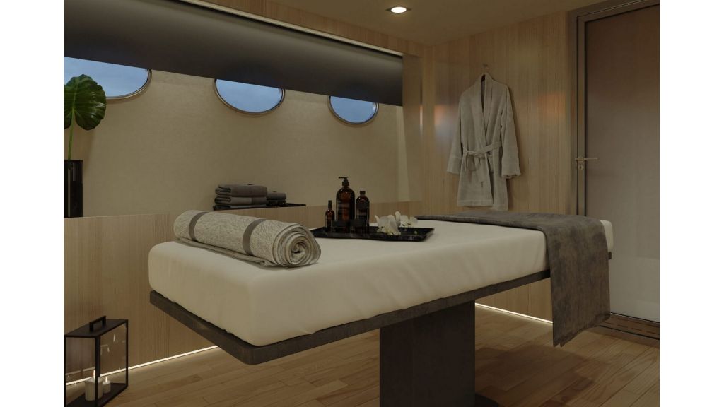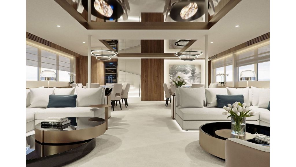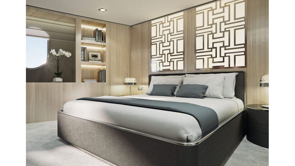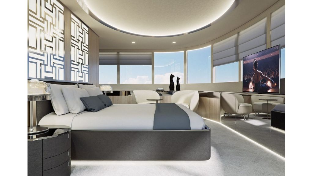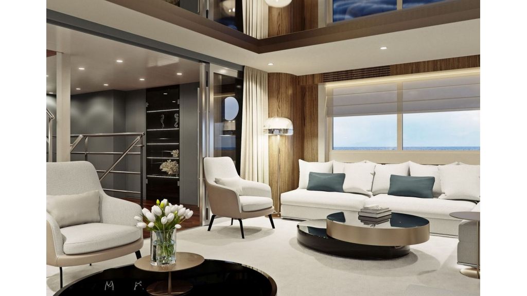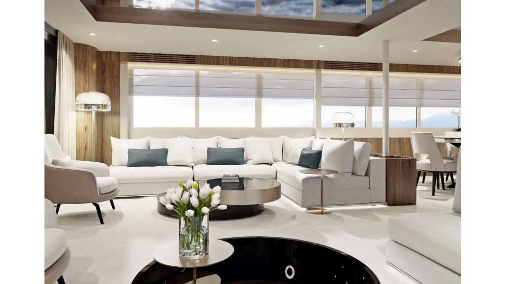 The yacht’s interior features a contemporary design with clean lines, neutral tones and high-quality materials. The main saloon is spacious and filled with natural light thanks to its large windows. It includes elegant seating areas, a dining table for group meals and a modern entertainment system. The interior ambiance creates a serene and luxurious environment throughout the voyage.