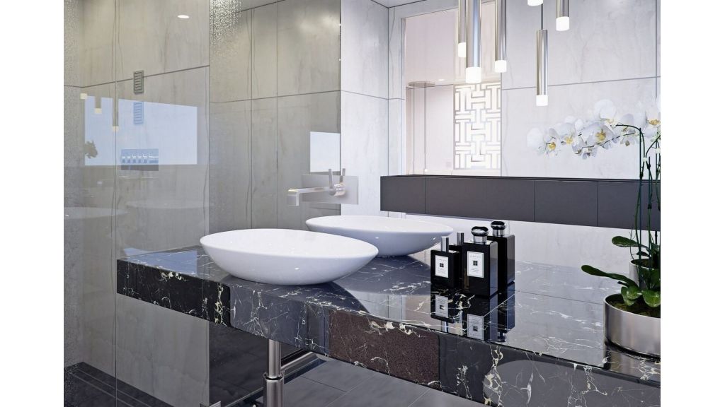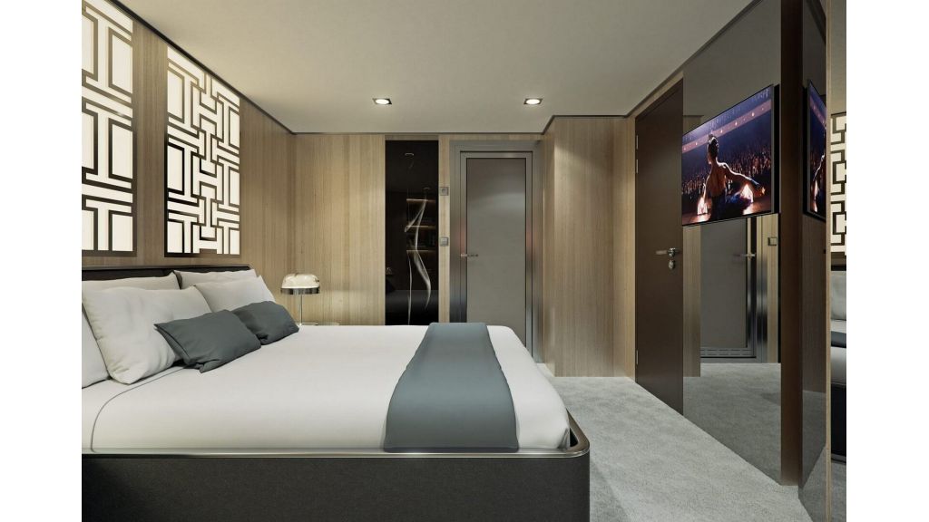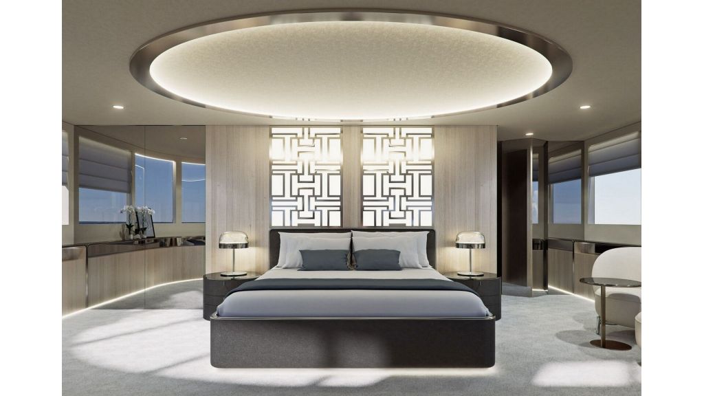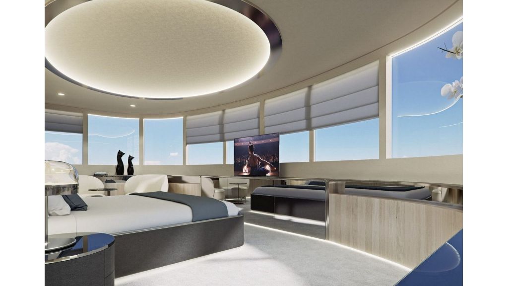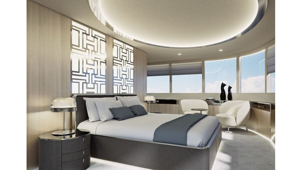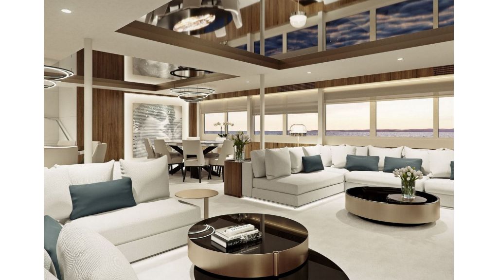 The yacht’s interior features a contemporary design with clean lines, neutral tones and high-quality materials. The main saloon is spacious and filled with natural light thanks to its large windows. It includes elegant seating areas, a dining table for group meals and a modern entertainment system. The interior ambiance creates a serene and luxurious environment throughout the voyage.