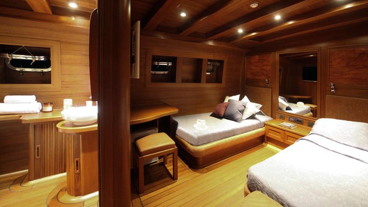 Built in 2015, Gulet Cakır Yıldız spans 43 meters in length and 8.90 meters in width. She is designed to accommodate up to 10 guests in 5 elegant cabins: 1 Master, 1 Double, and 3 Twin cabins. Our cabins are spacious, airy, and modern, featuring a TV, air conditioning, shower, and WC to ensure a comfortable blue cruise experience.