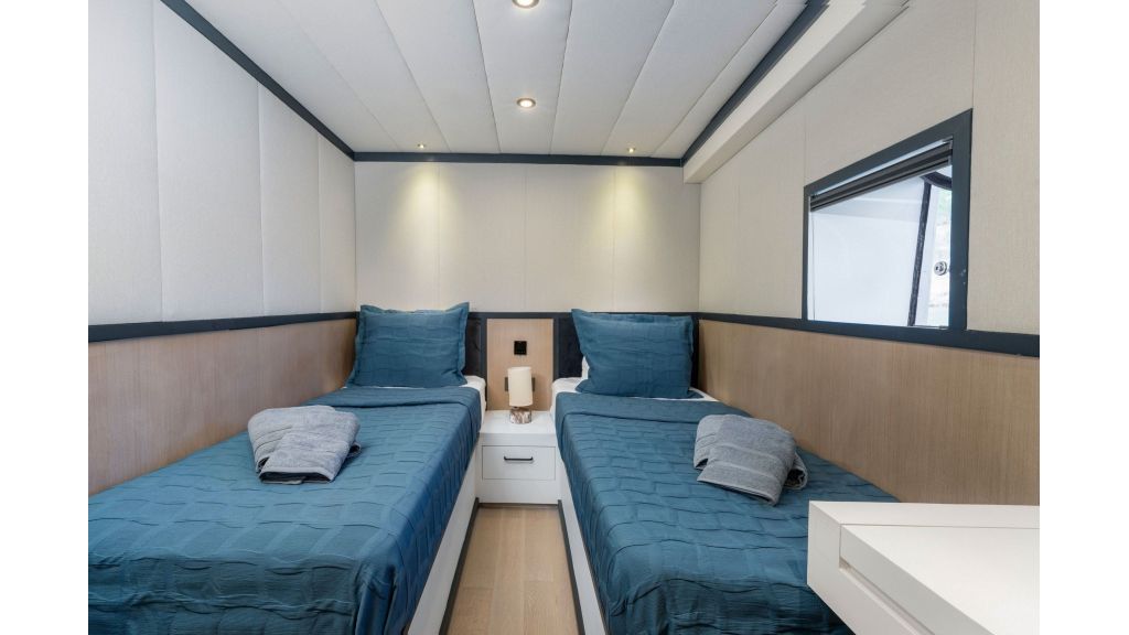 Powered by a 2 x 550 HP Volvo Penta engine and a 2 x 27 kW ONAN generator, Calm Dawn offers a fast and reliable yachting experience. Each of the cabins is elegantly designed and allows you to have an unforgettable travel experience.