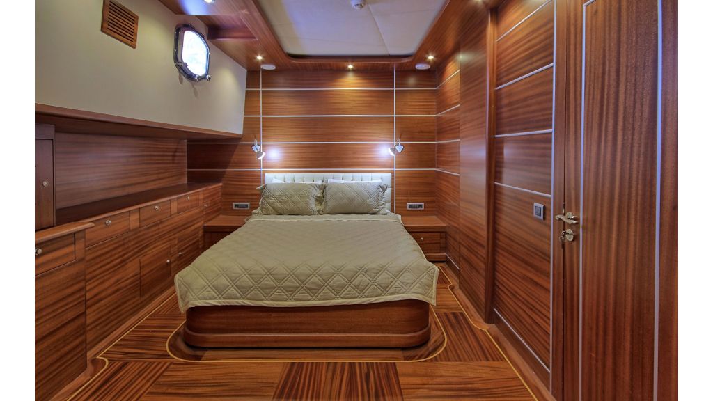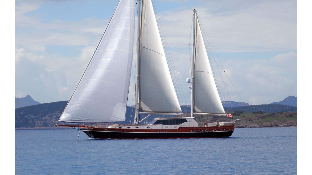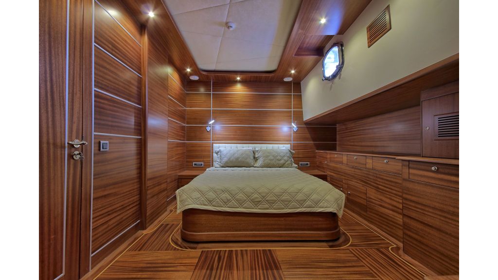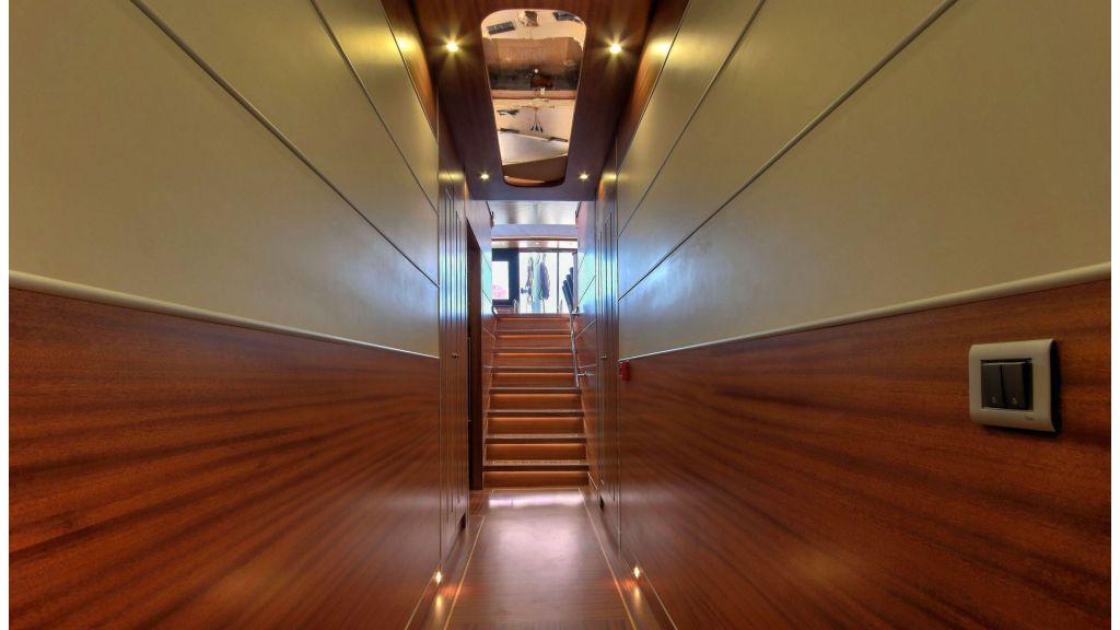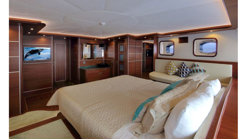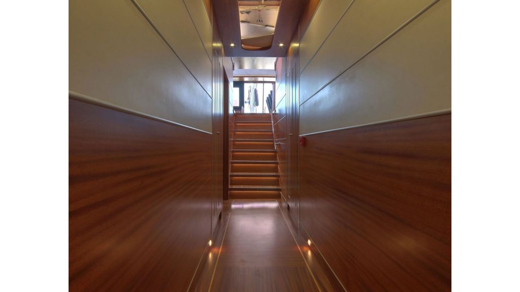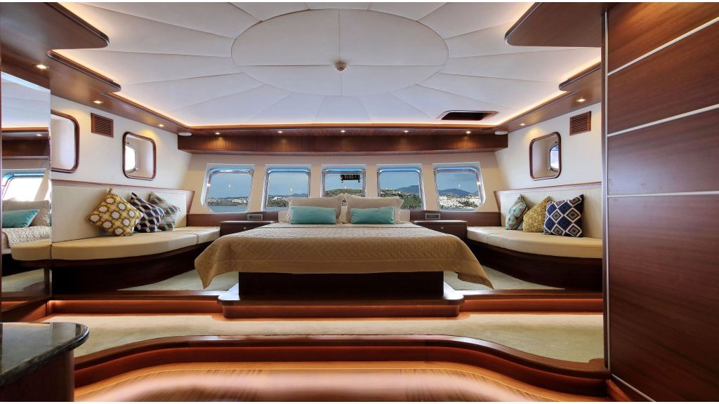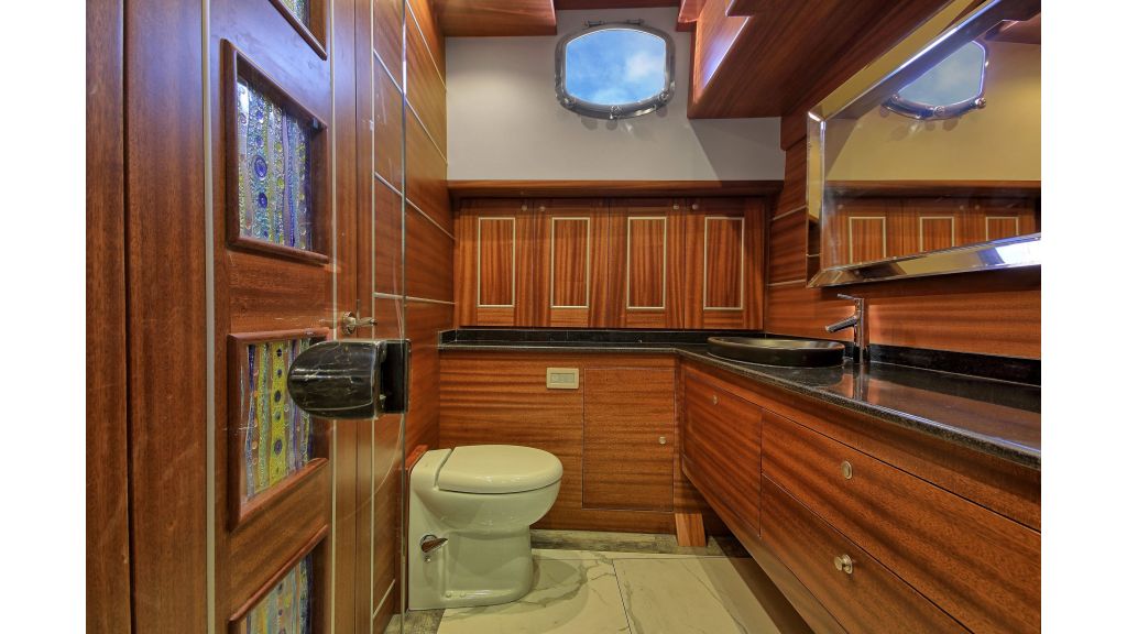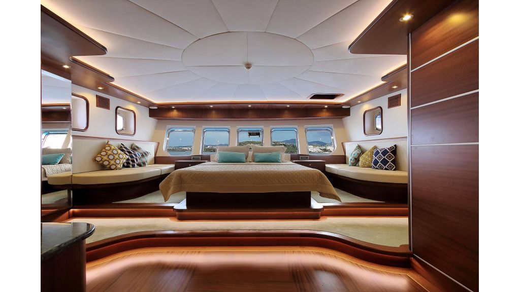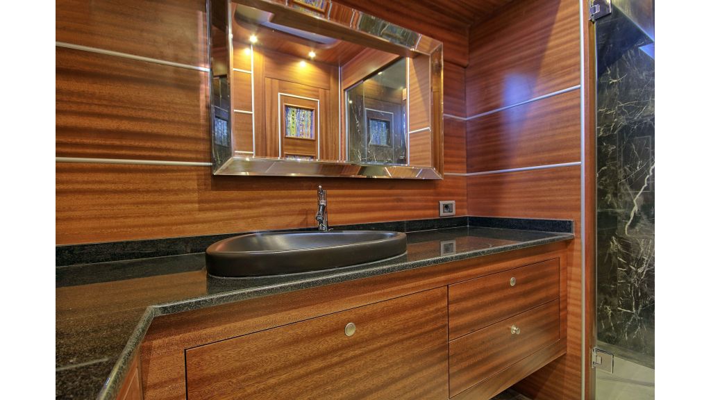 she is 41 meters long epoxy laminated mahogany sculpture and full of amenities. Only 5 cabins for 10 guests in such large sailing yacht that is aimed to offer utmost luxury to her guests.