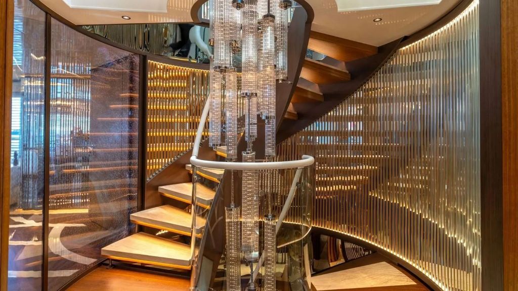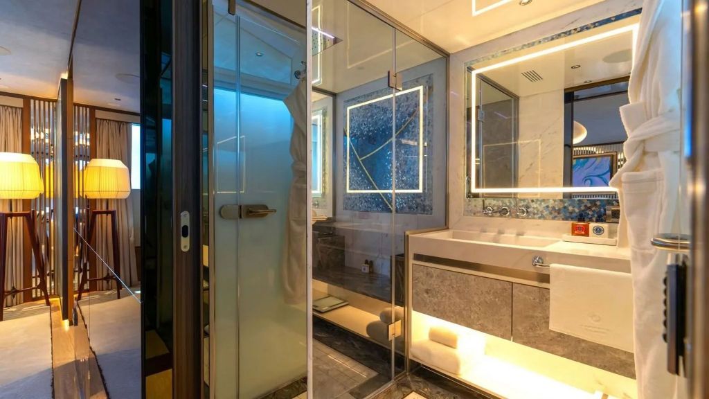 The sky lounge serves as a multifunctional retreat, where guests can unwind or transform the space into a personal nightclub. The area’s adaptable design, including a modular L-shaped sofa, enables customization, from a cozy cinema setup to a lively entertainment hub.
