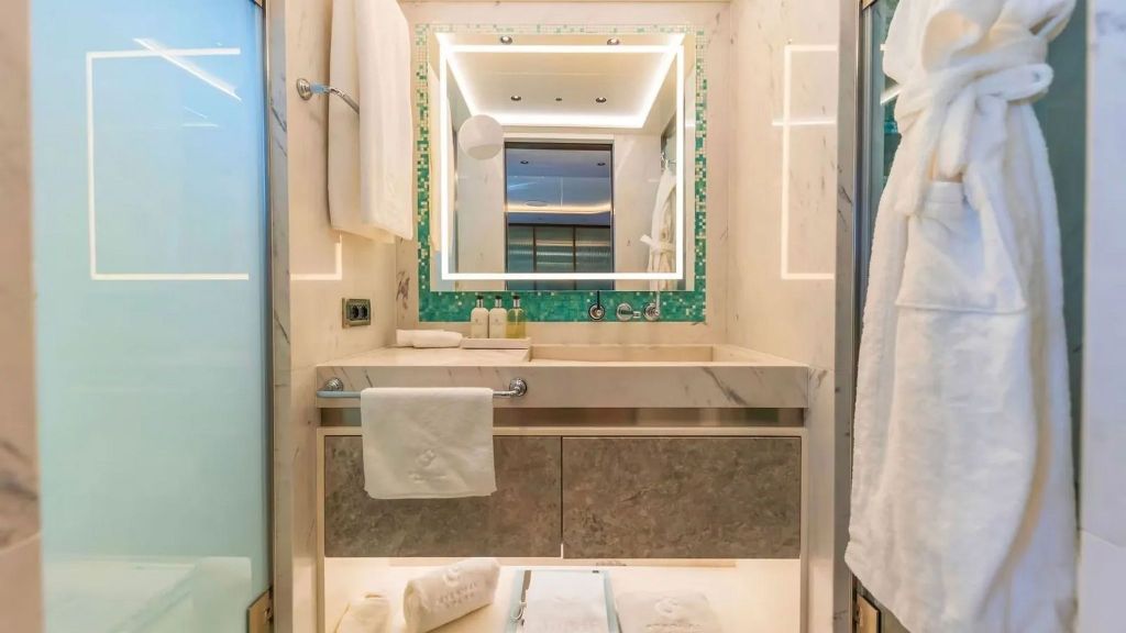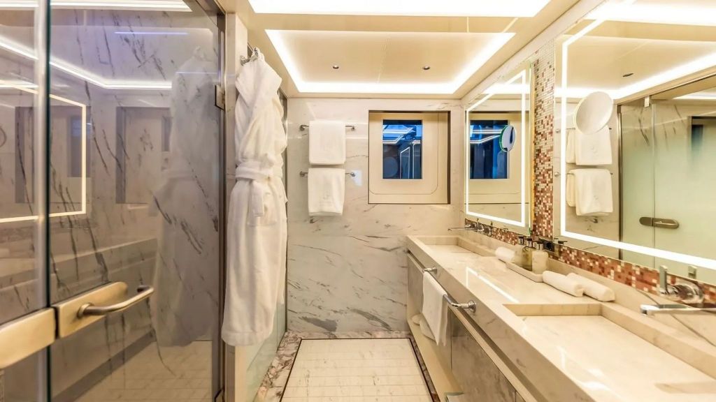 The master suite redefines luxury with its well-appointed layout, featuring a distinct study/office area leading to an expansive central space. The suite is thoughtfully divided, catering to individual preferences with dedicated ‘his’ and ‘her’ sections, including separate wardrobe and bathroom areas. At the heart of the suite lies an extraordinary large berth, setting a new standard for luxury in 50-meter class yachts.