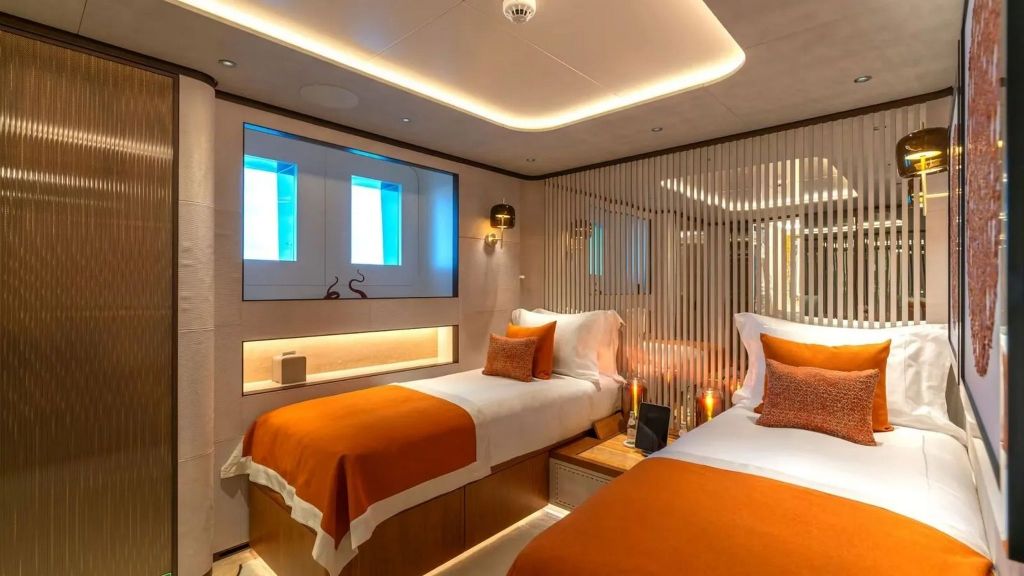 Eternal Spark breaks new ground with its convertible twin cabin, offering unmatched flexibility compared to typical yacht designs. Both berths can move and join seamlessly, enhancing guest convenience and space utilization. The innovative design includes a fully movable nightstand cabinet, allowing for effortless space transformation.