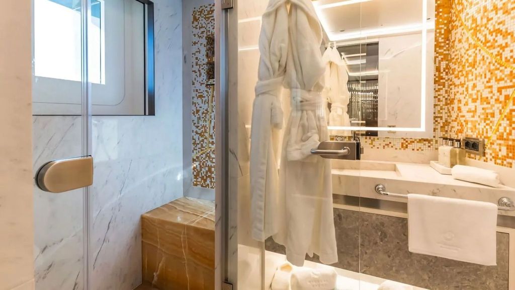 The yacht’s beach club is a realm of relaxation, featuring a full-height sauna with glass walls for enjoying breathtaking sea views. Adjacent, a strategically placed television offers entertainment, enhancing the sauna experience. This area is an idyllic haven for relaxation and entertainment by the sea.