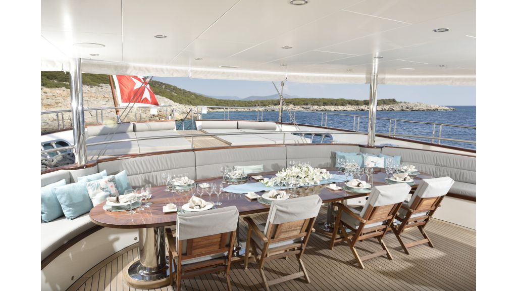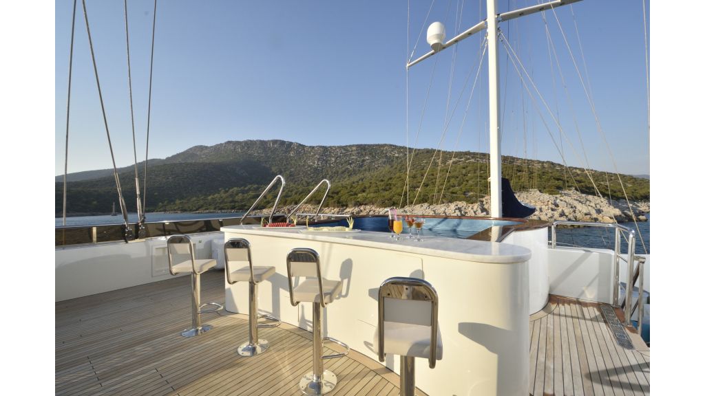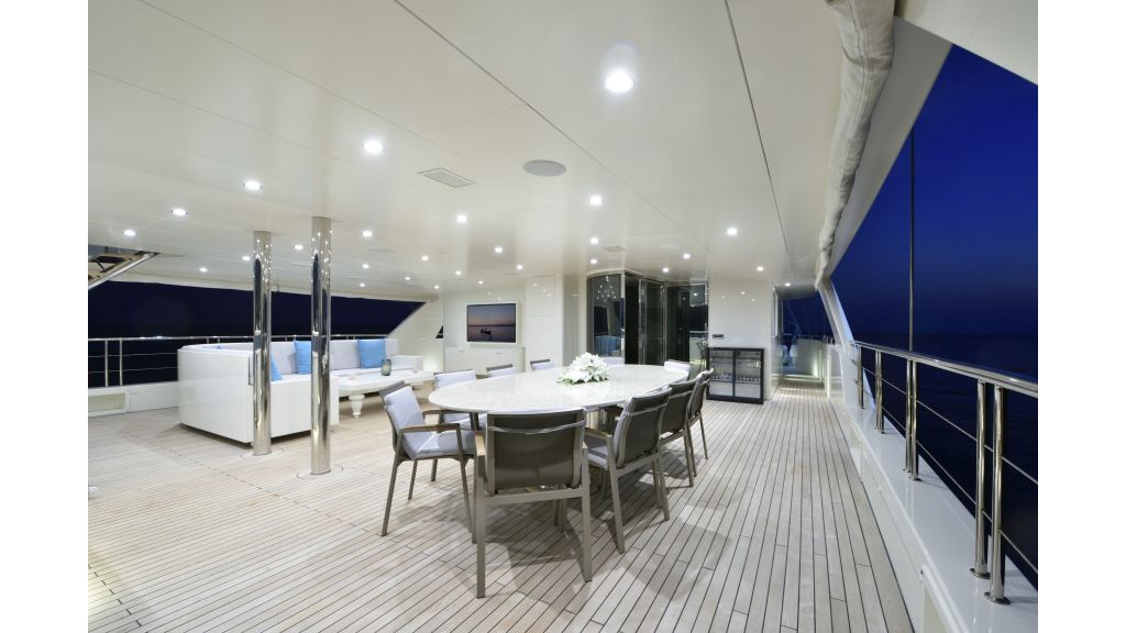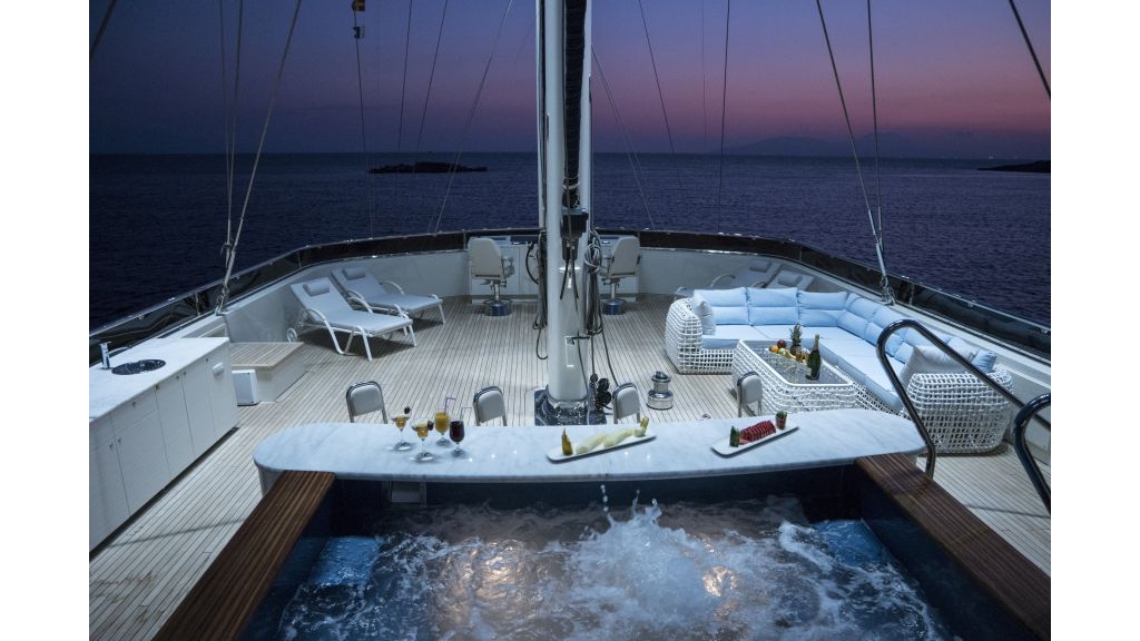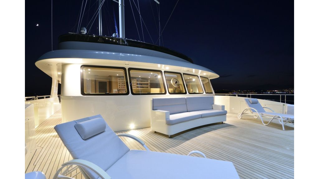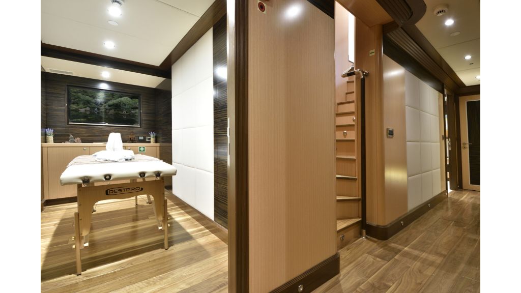 She has a large salon on the main deck with a dining place and sofas, four sunbathing areas, there is a pool on a flybridge deck, and a very large comfortable sky lounge with a bar, sofas, and dining place. She has also one massage room and one sauna for a very relaxing time for guests on board.