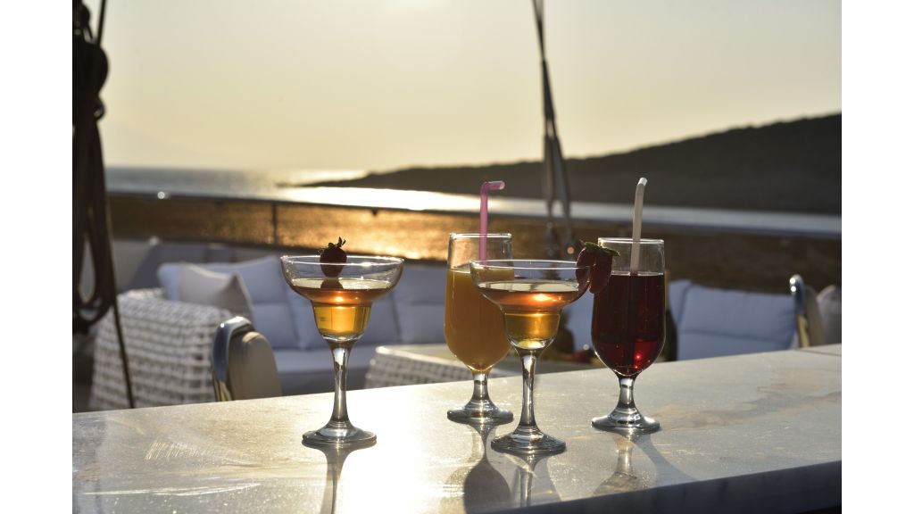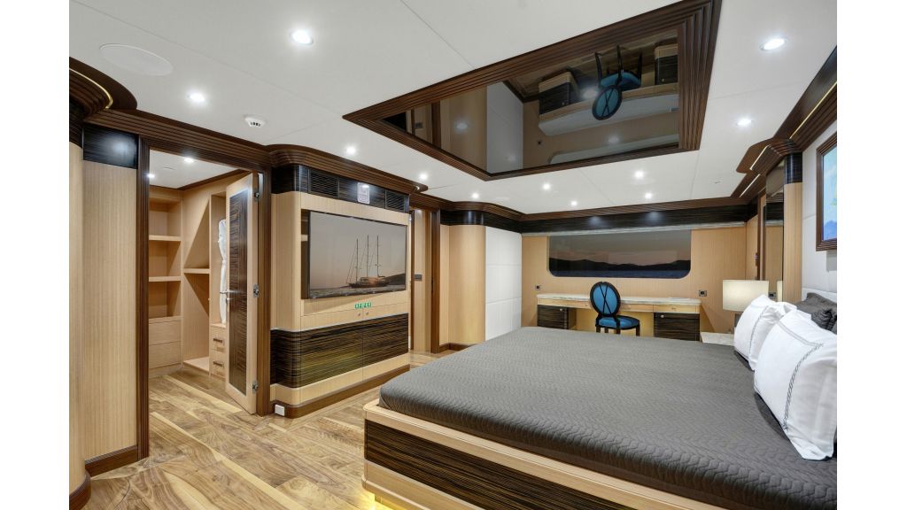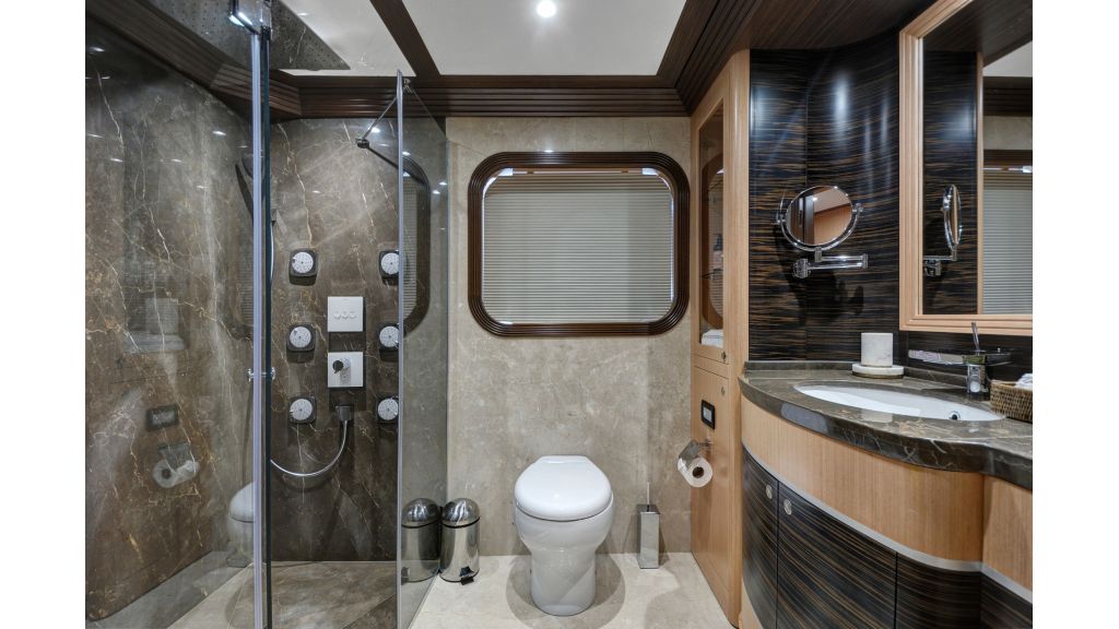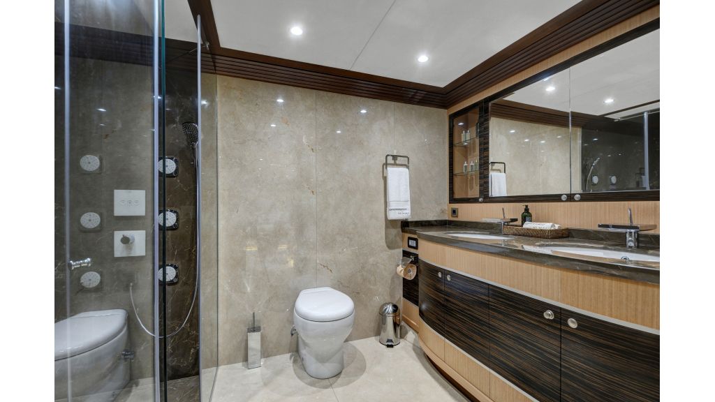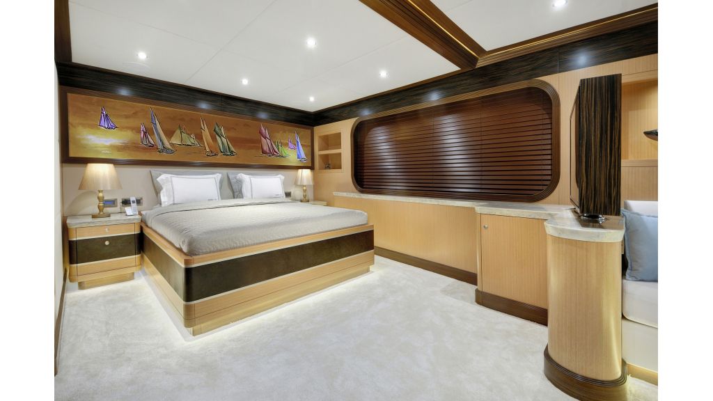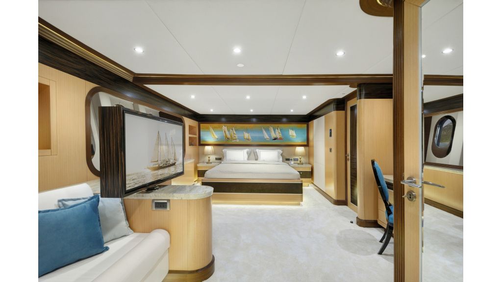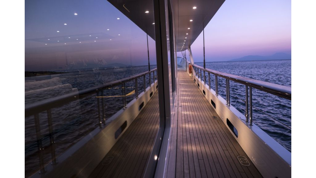 She has a large salon on the main deck with a dining place and sofas, four sunbathing areas, there is a pool on a flybridge deck, and a very large comfortable sky lounge with a bar, sofas, and dining place. She has also one massage room and one sauna for a very relaxing time for guests on board.