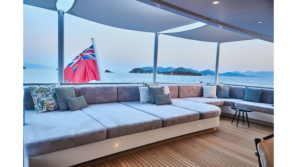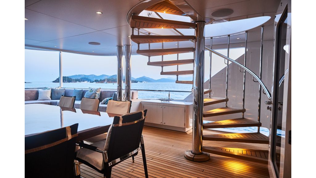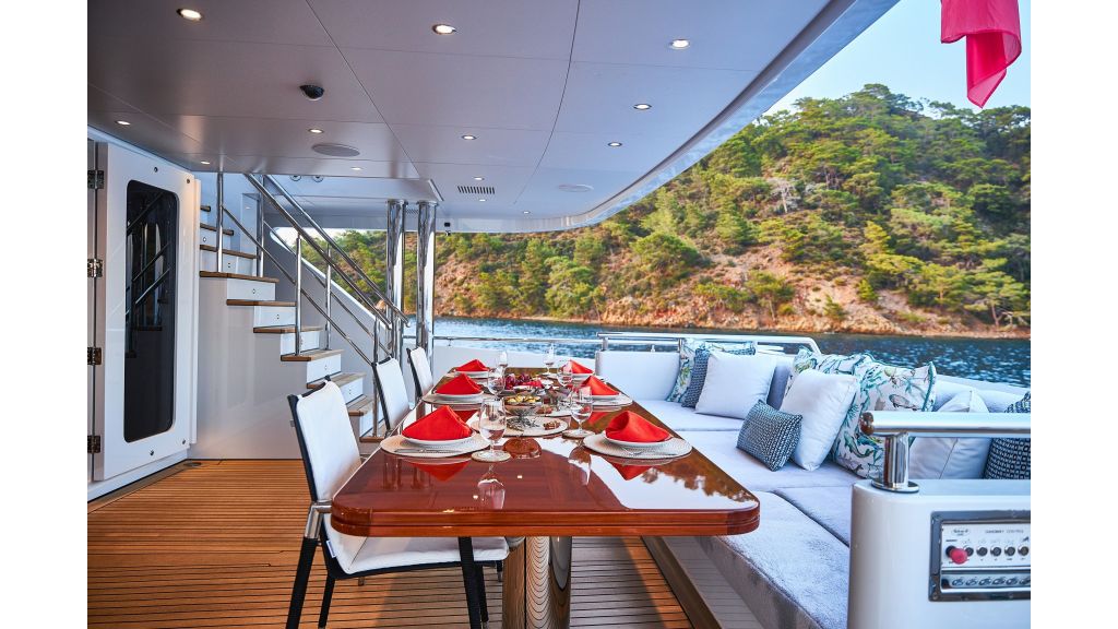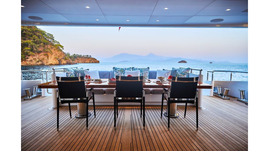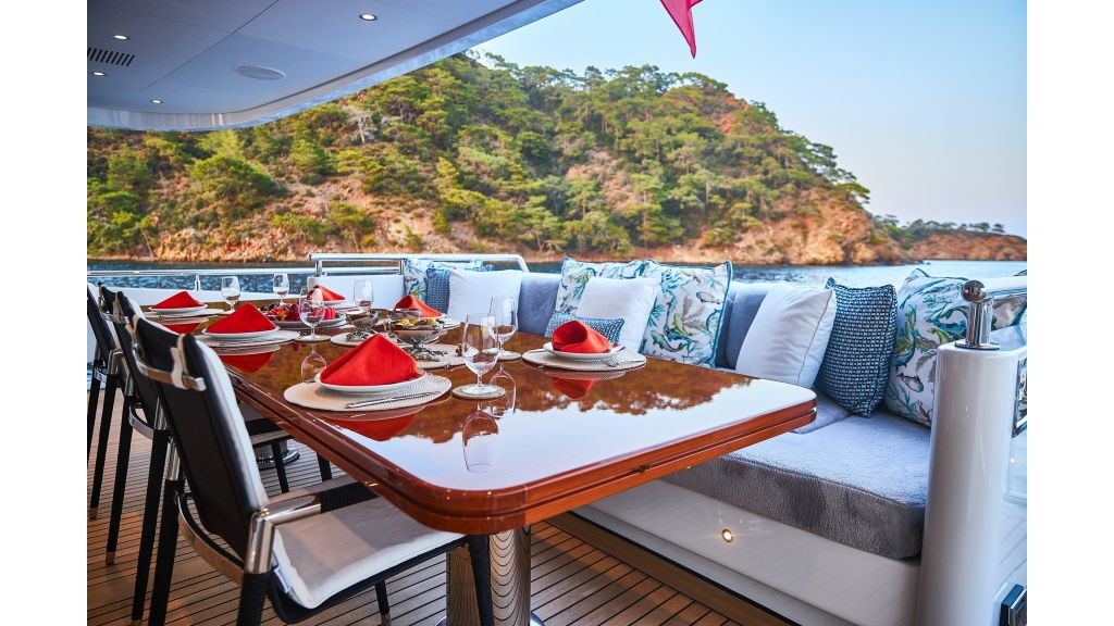 There is a comfortable dining table and seating arrangement on the main deck and upper deck, while the sun terrace offers a charming experience with its view. Jacuzzi combines elegance and comfort with Deckchairs and stunning views.