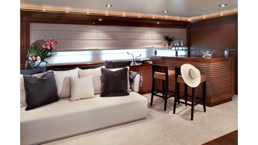 The interior design of Rubeccan reflects a contemporary luxury yacht concept while maintaining a warm and welcoming atmosphere. The comprehensive refit completed in 2022 upgraded all interior areas, including the main salon, guest cabins, and shared living spaces. Large panoramic windows allow natural light to fill the yacht, while high-quality materials and elegant finishes create a refined onboard ambiance that enhances the overall charter experience.