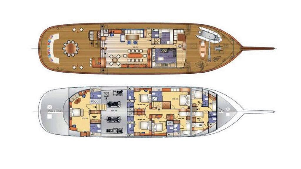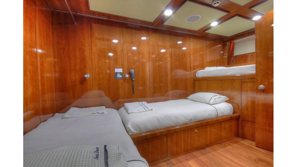1 captain (double) with en-suite bathroom & 3 crew cabins accommodating 6 crew & 2 bathrooms.