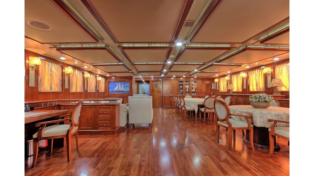 Main Deck: 80 m2 bar & dining salon, Fully equipped galley & provision rooms, utility room, day head, wheelhouse forward with crew mess, 85 m2 aft deck area with dining table for guests, steering console, aft cushions 50 m2 of water toys & sports deck forward 110 m2 upper deck with sunbathing cushions.