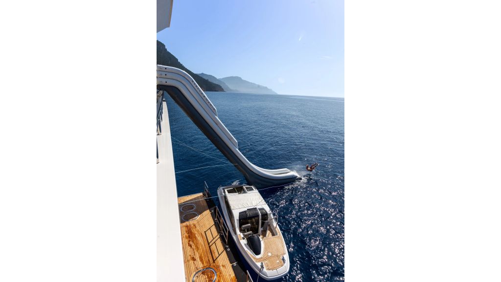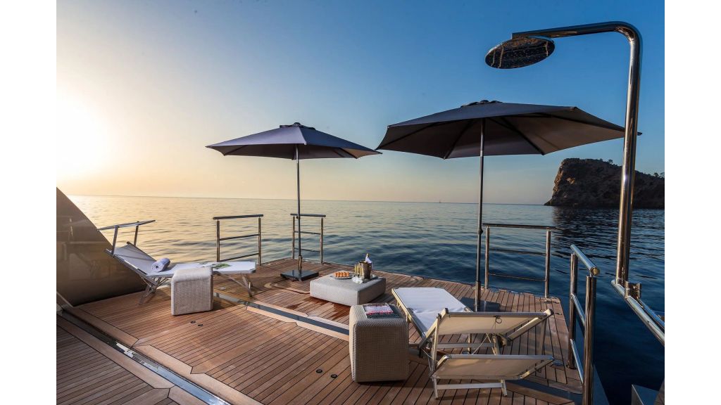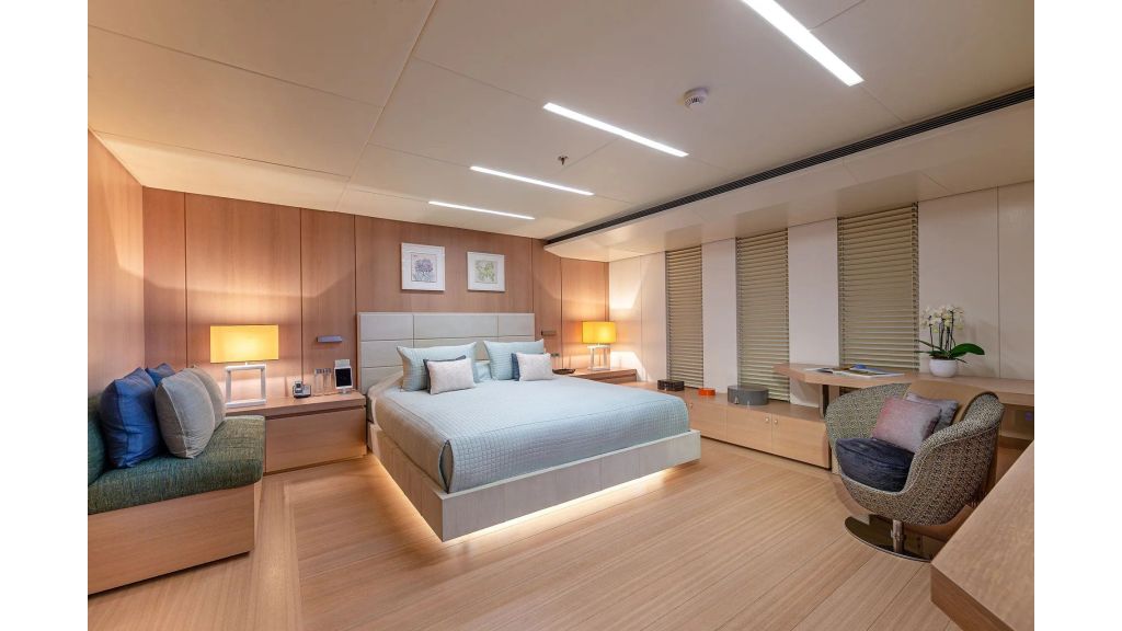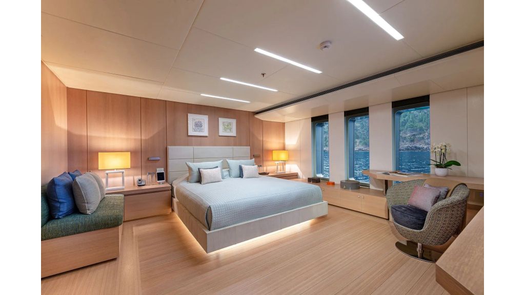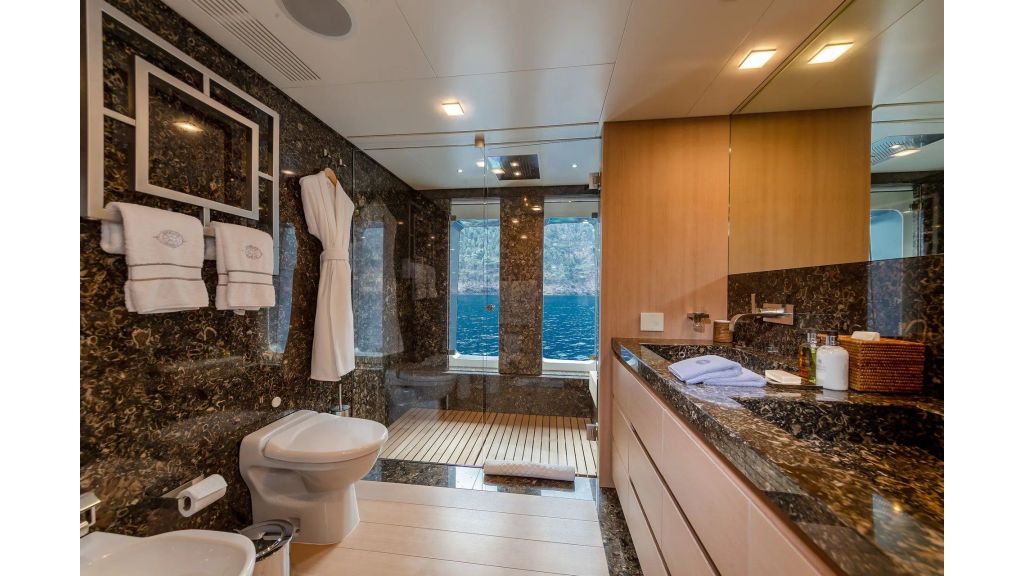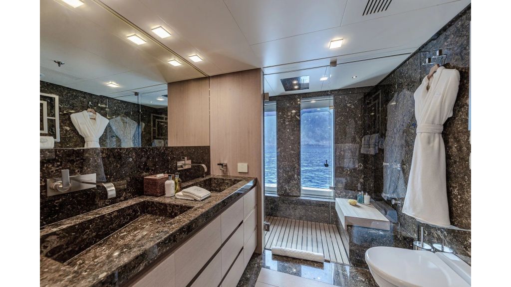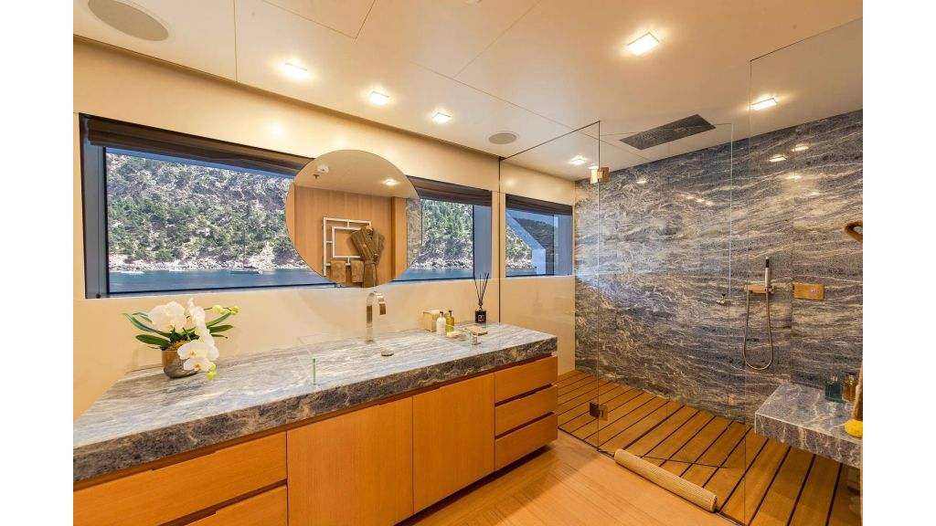 The owner’s private deck offers ultimate seclusion with an office, day room, sunbathing area, and two elegant bathrooms adorned with Brazilian blue marble. The remaining six guest suites on the main deck feature unique furnishings, ensuring comfort and style for all guests. Thanks to advanced stabilization, the yacht provides a smooth, quiet cruising experience.