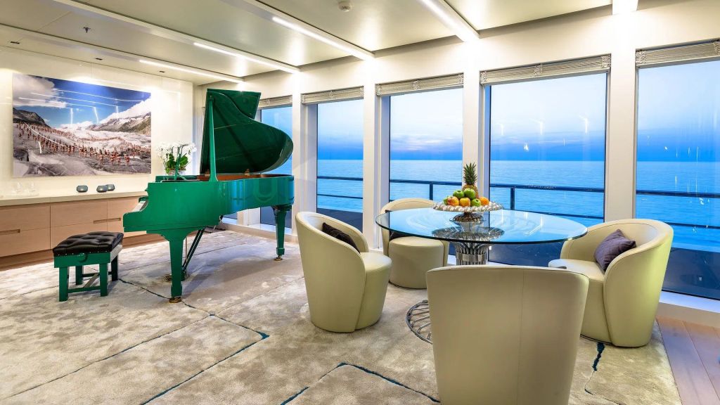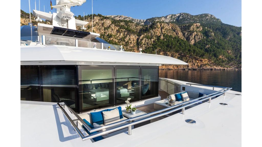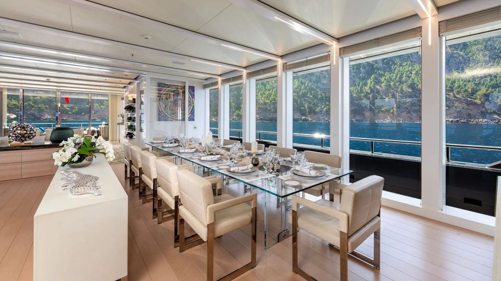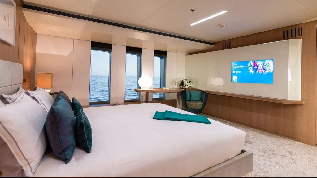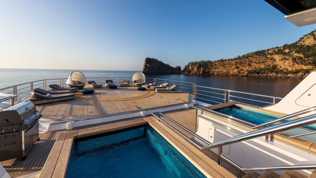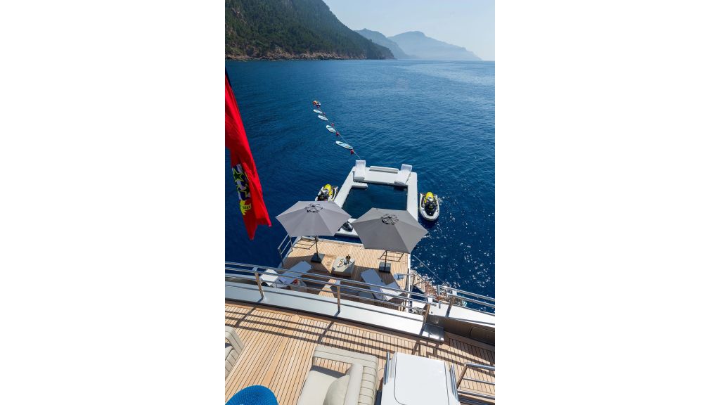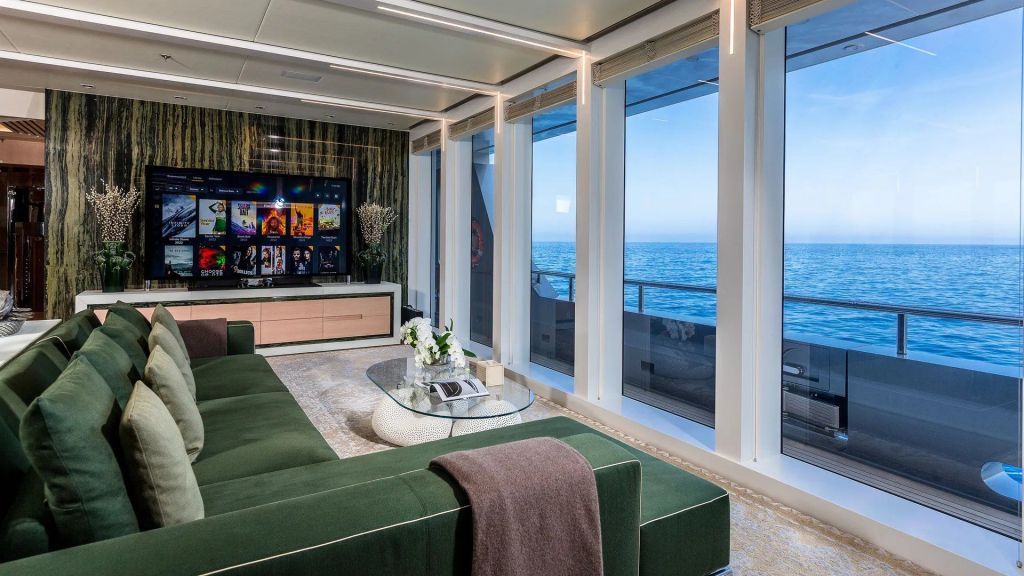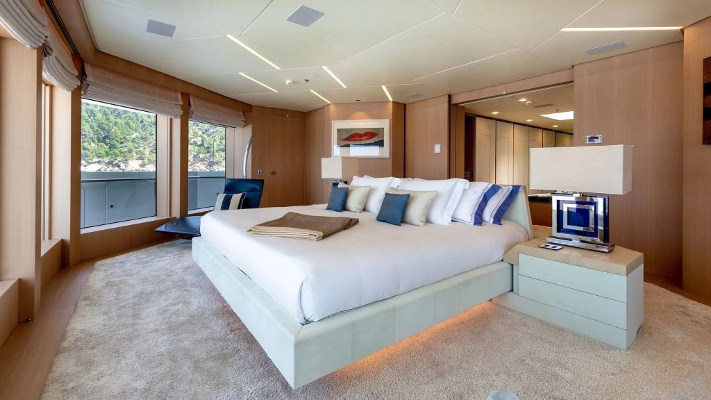 The owner’s private deck offers ultimate seclusion with an office, day room, sunbathing area, and two elegant bathrooms adorned with Brazilian blue marble. The remaining six guest suites on the main deck feature unique furnishings, ensuring comfort and style for all guests. Thanks to advanced stabilization, the yacht provides a smooth, quiet cruising experience.